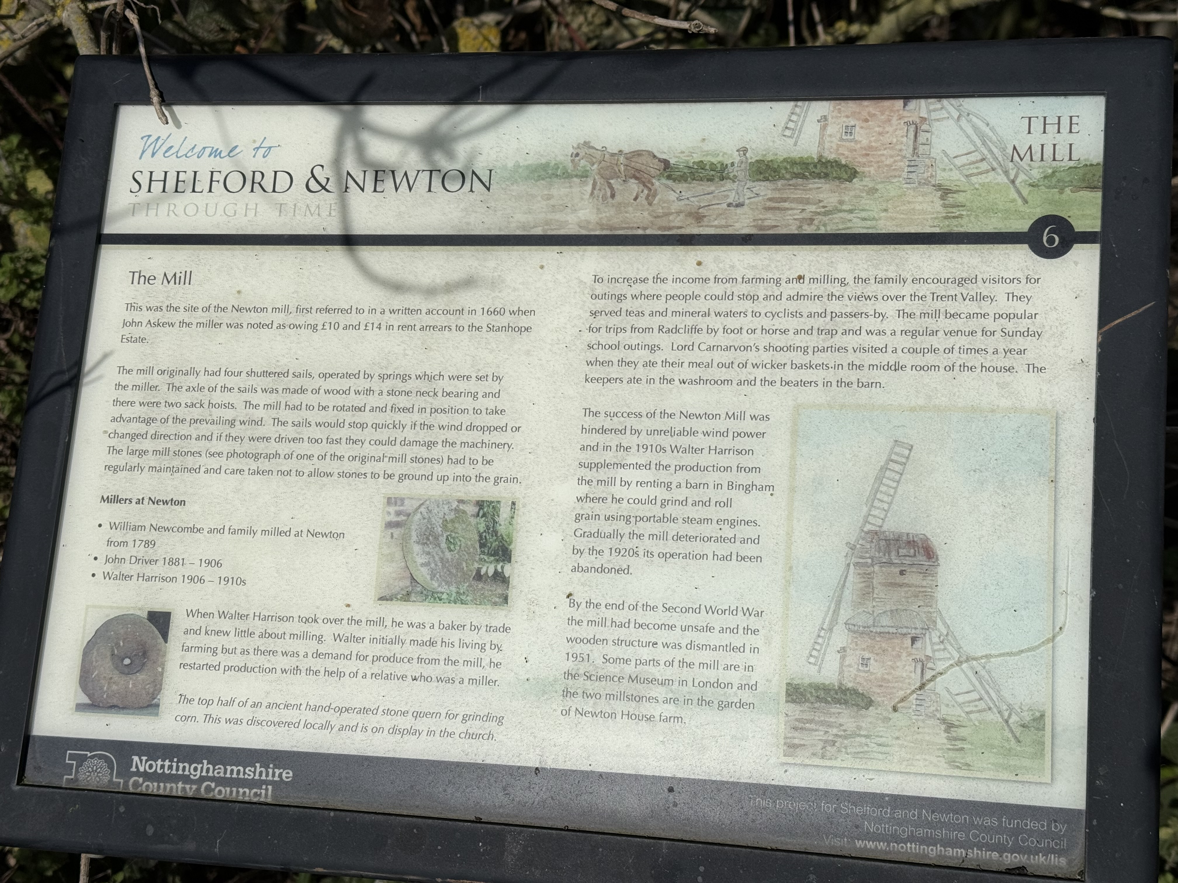 There is a small lay-by for parking just on the bend of the road and a gated footpath through the field the tower stands in. The information board shown above gives a short history of the mill and is located just by the gate and parking.