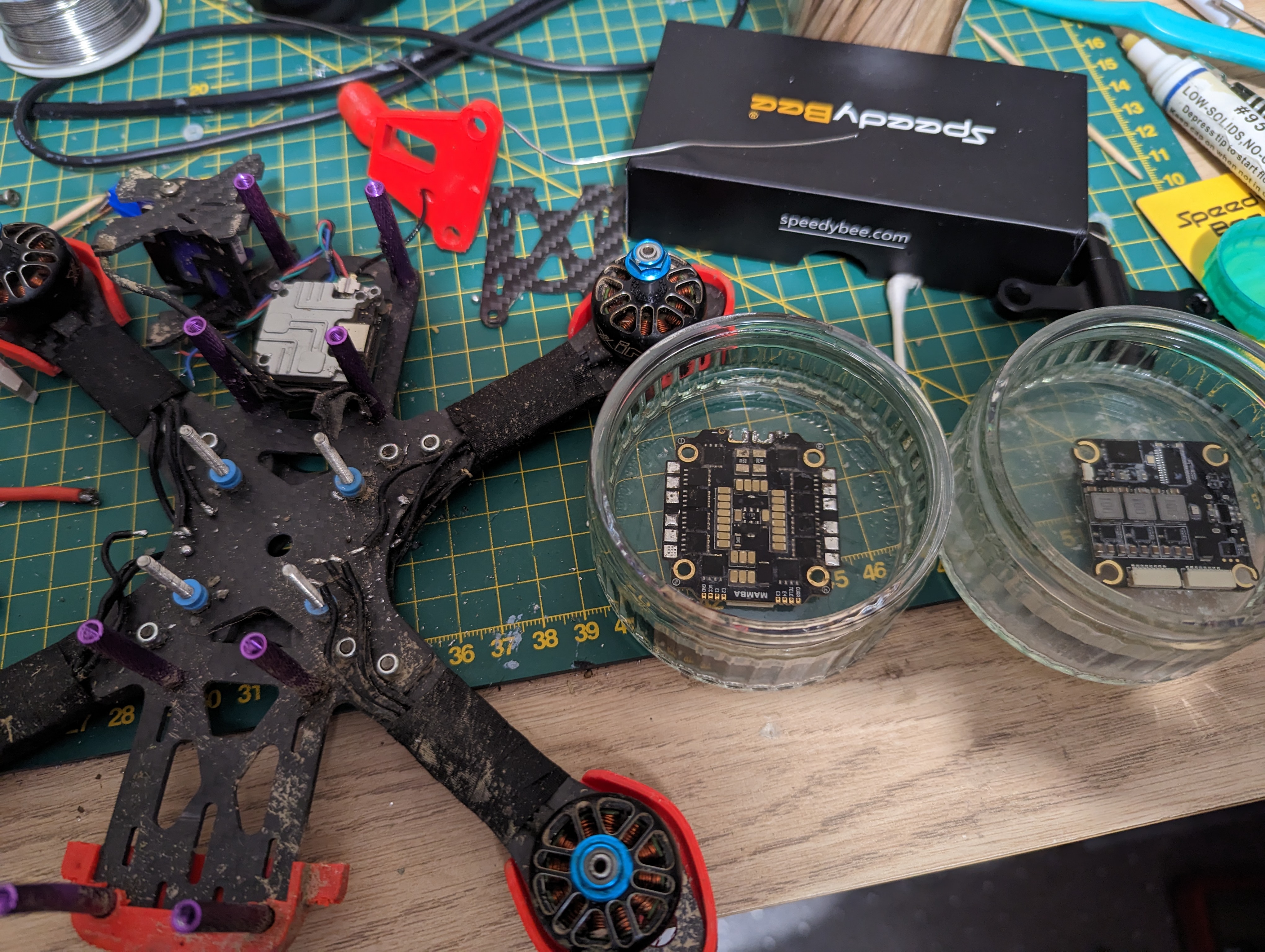 As I’m transplanting the FC and ESC of my old Martian to the new AOS 5 frame, unsoldered, and giving them a bath before going in…