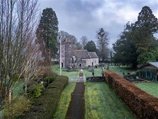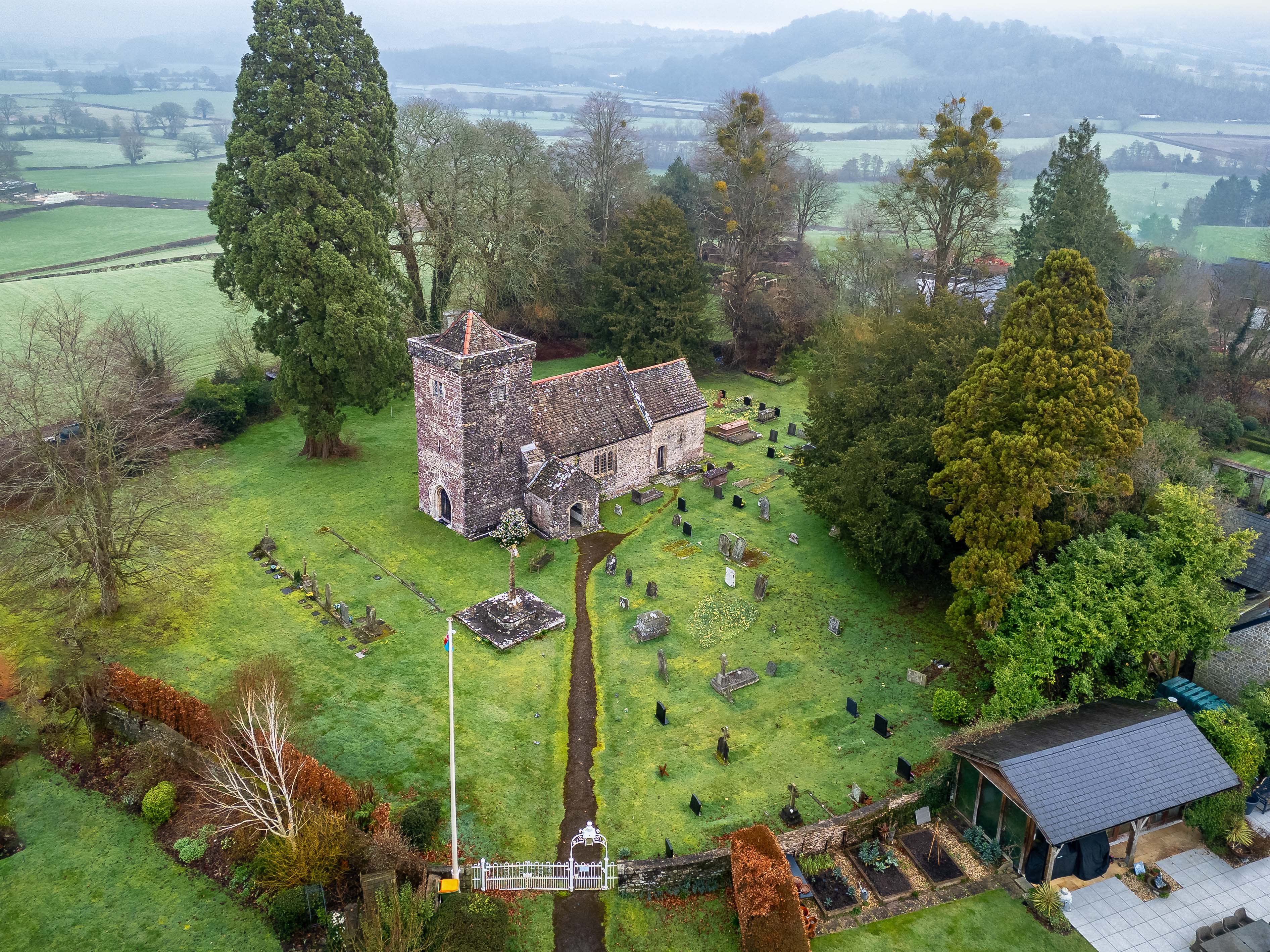 The image highlights the church’s secluded position within the rolling Monmouthshire landscape. The sprawling graveyard, dotted with weathered headstones, underscores its role as a focal point for the community over the centuries.