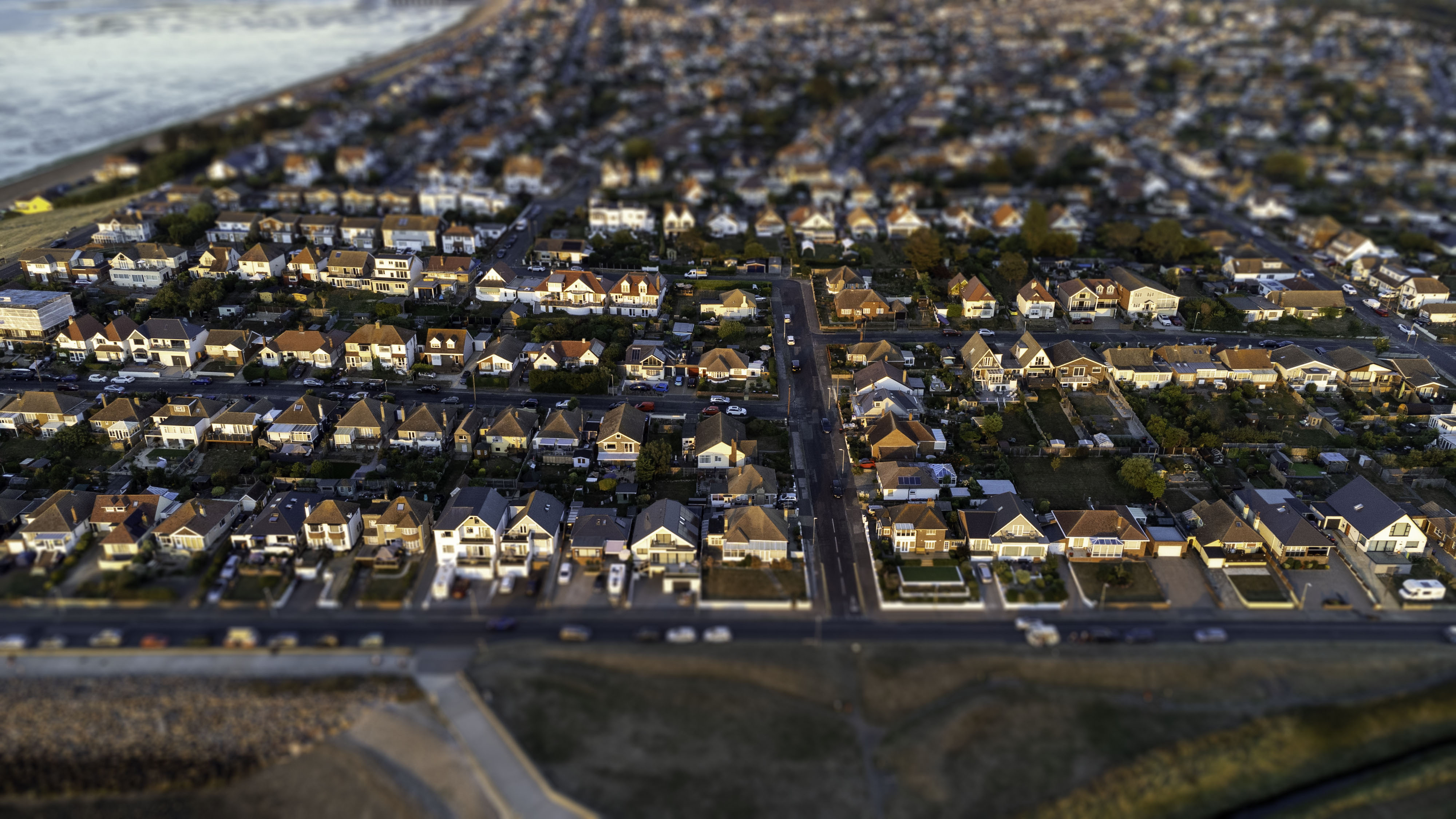 That blurring effect makes those houses look smaller or like they are close up to the drone.
