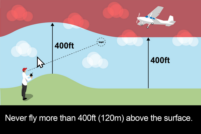 Flying below the legal height limit of 120m (400ft) will reduce the risk of coming across other aircraft, which normally fly higher than this."
