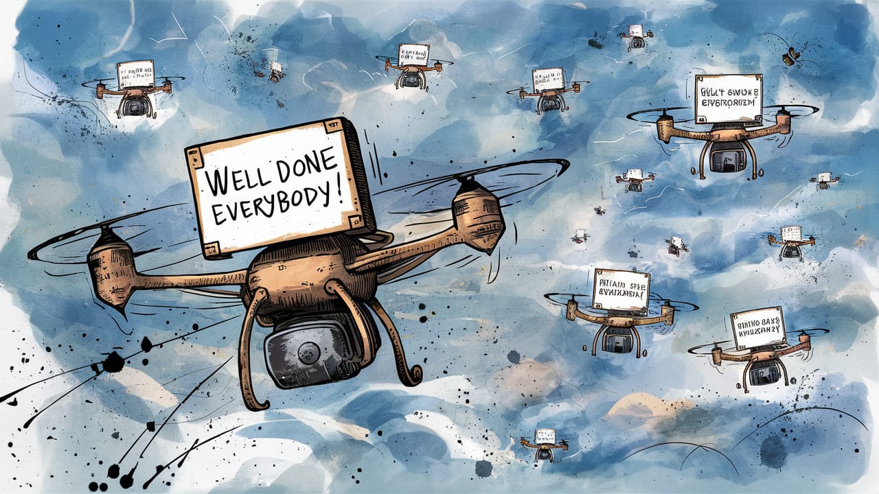 The picture(s) show a number of barely visible drones of various brands carrying illegible messages.