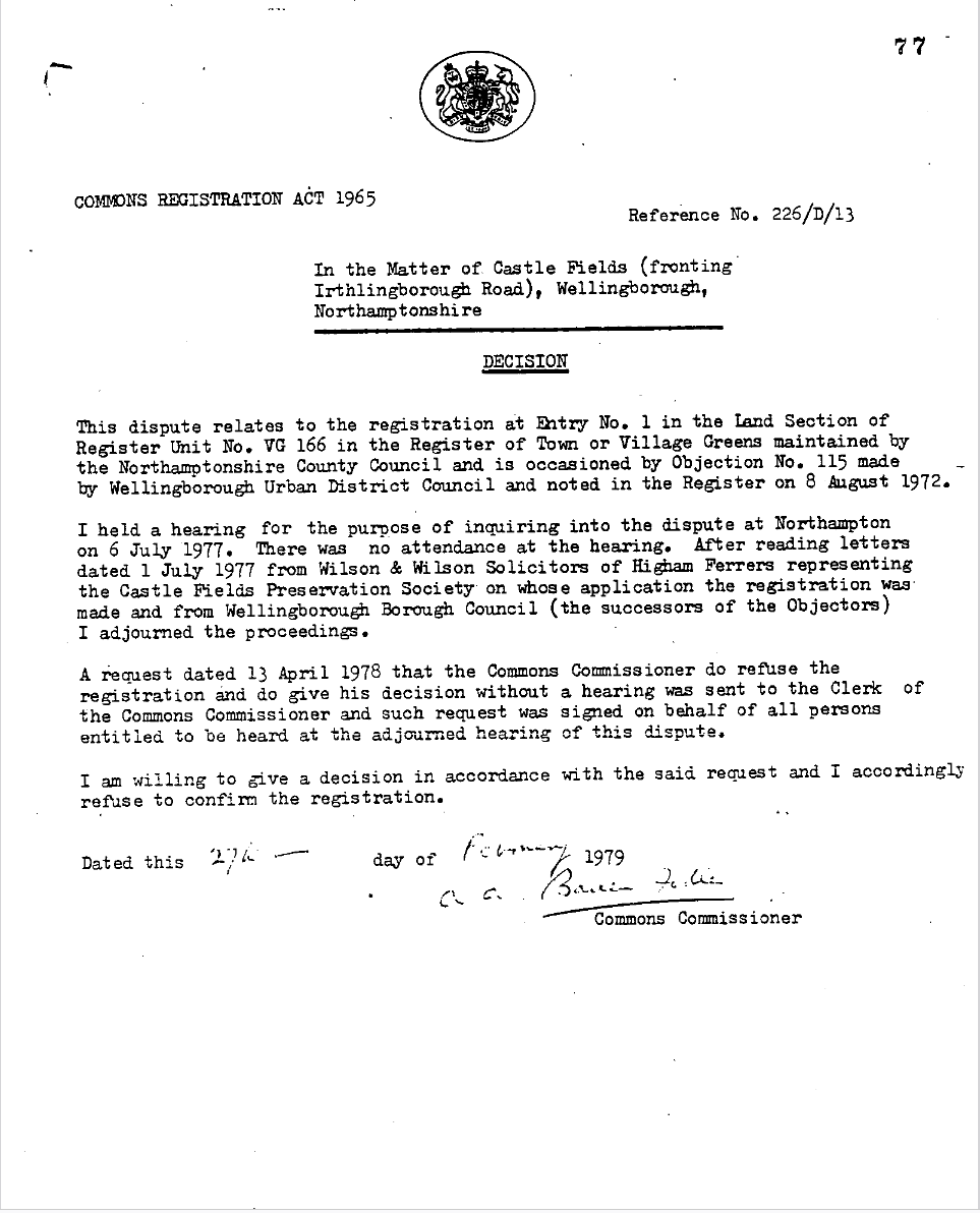 The application for registration as a Village Green by Wilson & Wilson, solicitors for the Castle Fields Preservation Society, was rejected by the Commons Commissioner on 27/02/1979