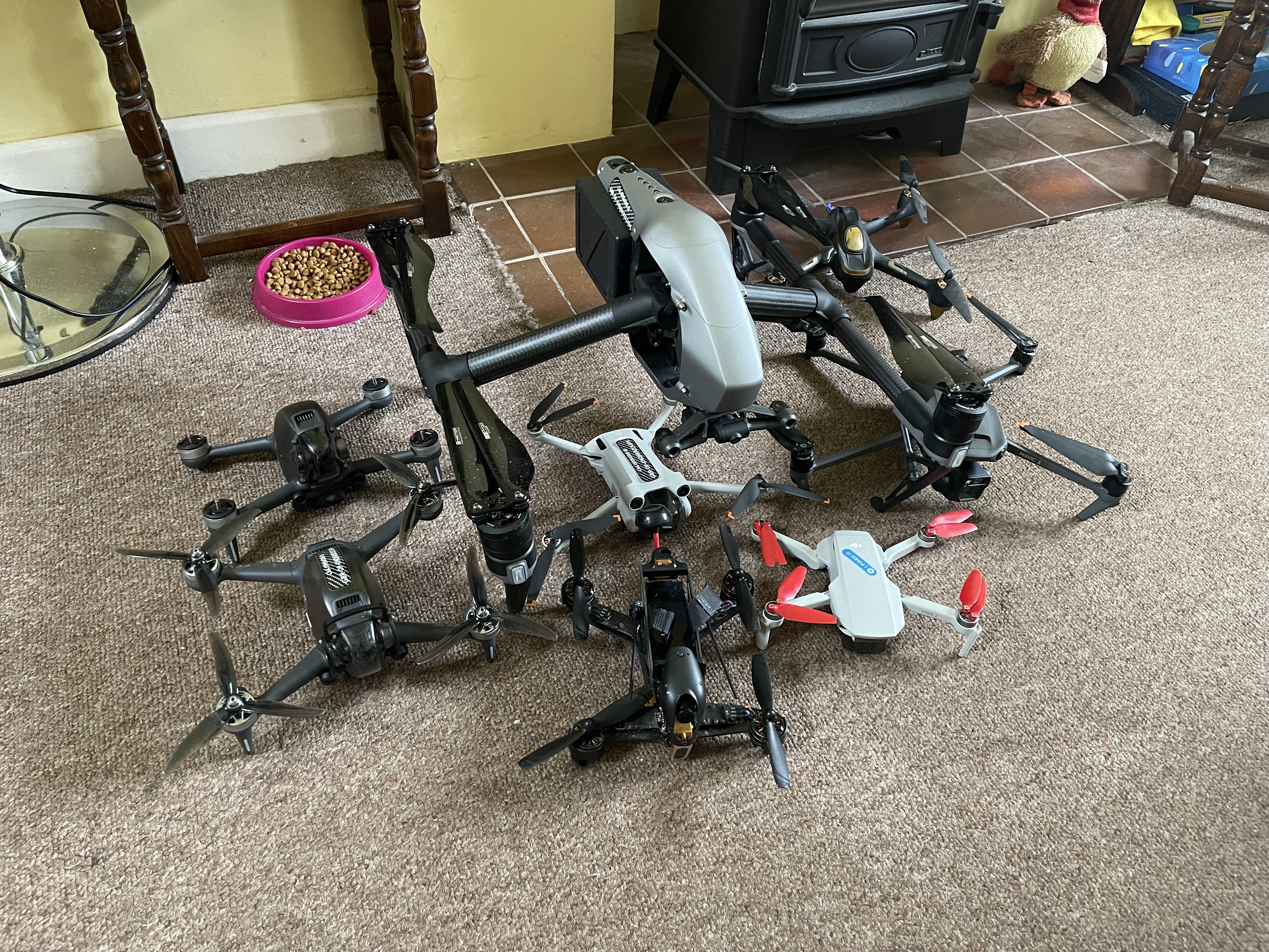 I’ve got a ratty old SG906Pro 2 which is what it is. It flies, mostly. ATyphoon H480 which I got for £200 which is a lovely bird but christ it’s heavy & christ it’s a faf to get it up, the latest addition to the fleet is an M3P, what a little ship that is and I’ve got access to an original Mini whenever I choose to use it.