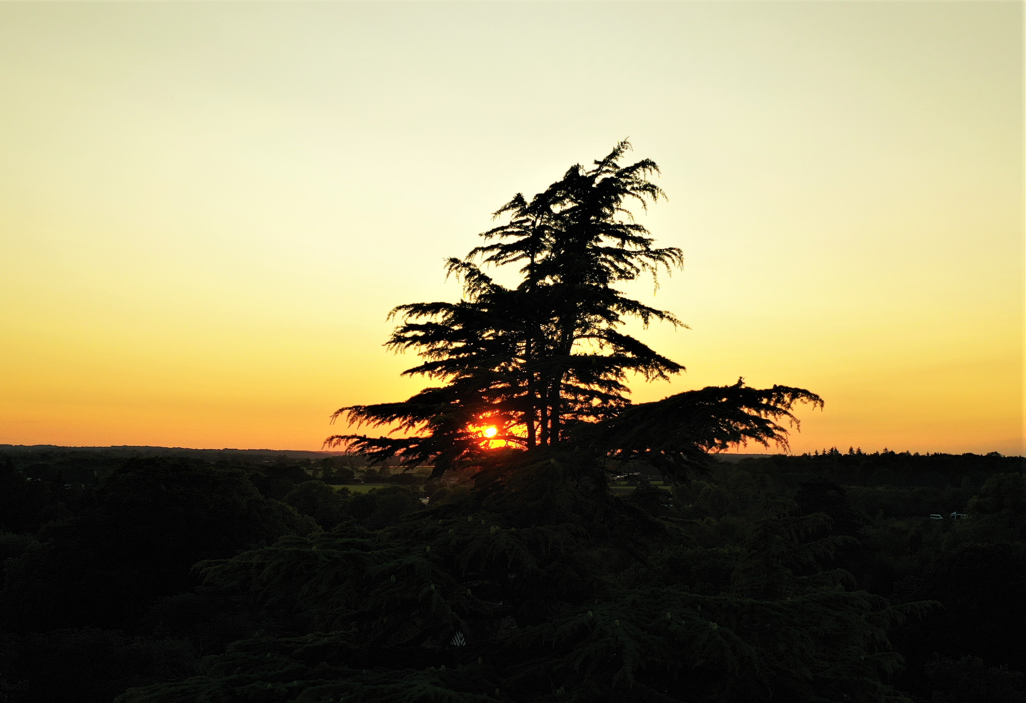 Entry #5 - sunset through (multiple) pine trees at Chorleywood House & Gardens, 15th July 2019 - taken at 27m height @ 9:02pm