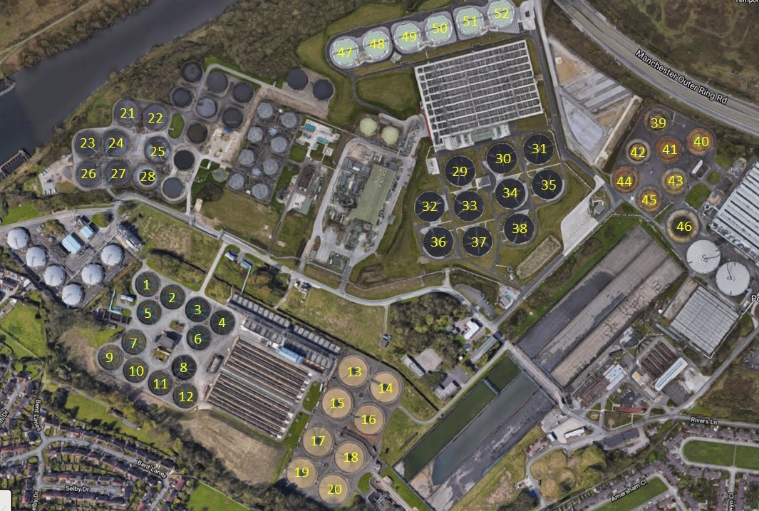 My understanding is that tanks 1-46 are trickle filters and sedimentation tanks / clarifiers (all as per the example photo provided), while 47-52 are the same thing with odour control roofing. I’ve not counted tanks which I believe are sludge digesters (e.g. those visible closest in the photo and bottom left in the layout plan) or where I really don’t have a clue what they are.
