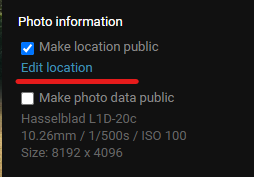 I’ve just had a look and, on the PC, there is a settings sidebar when you image has been uploaded. It gives you oprions for description , filter, HDR and the like. If you scroll to the bottom there is an option for location infor mation to be shown: