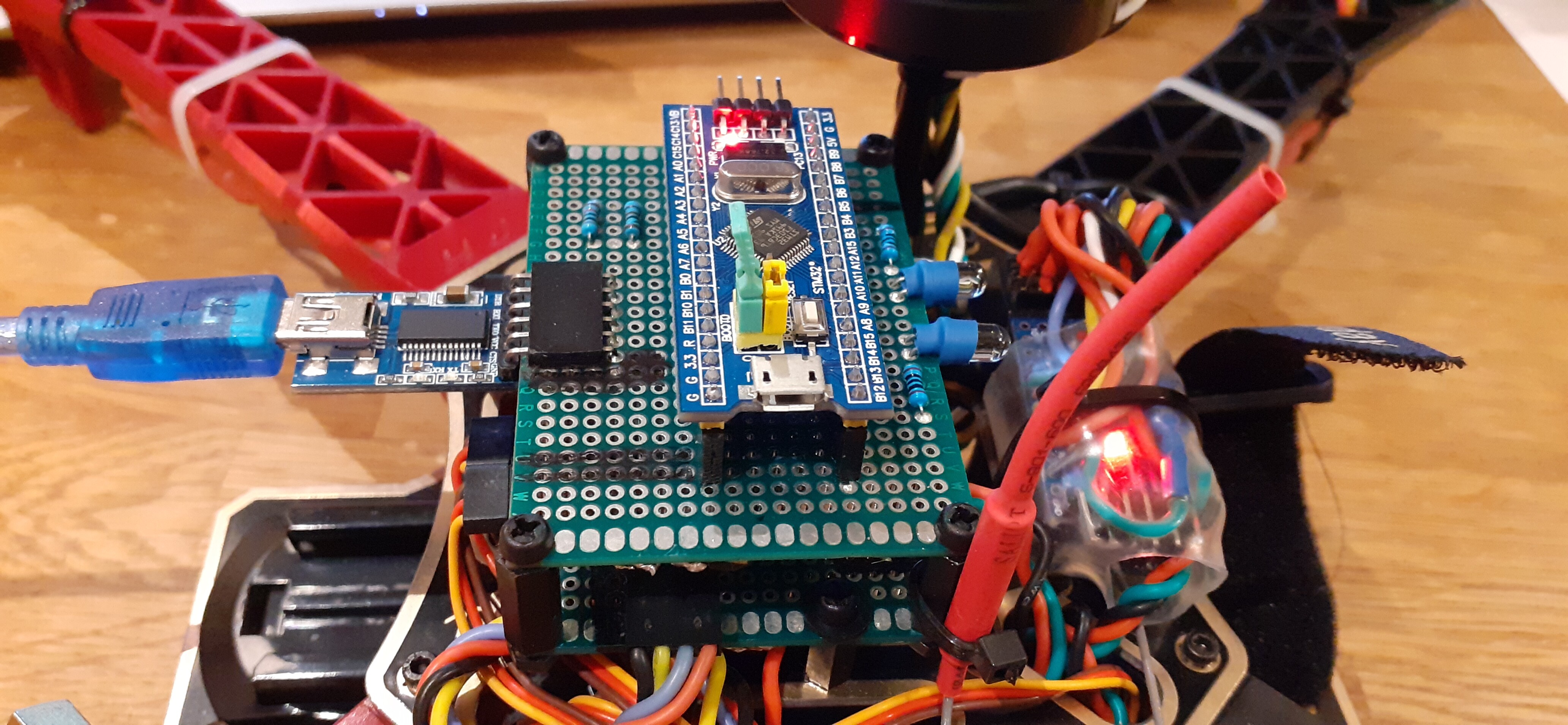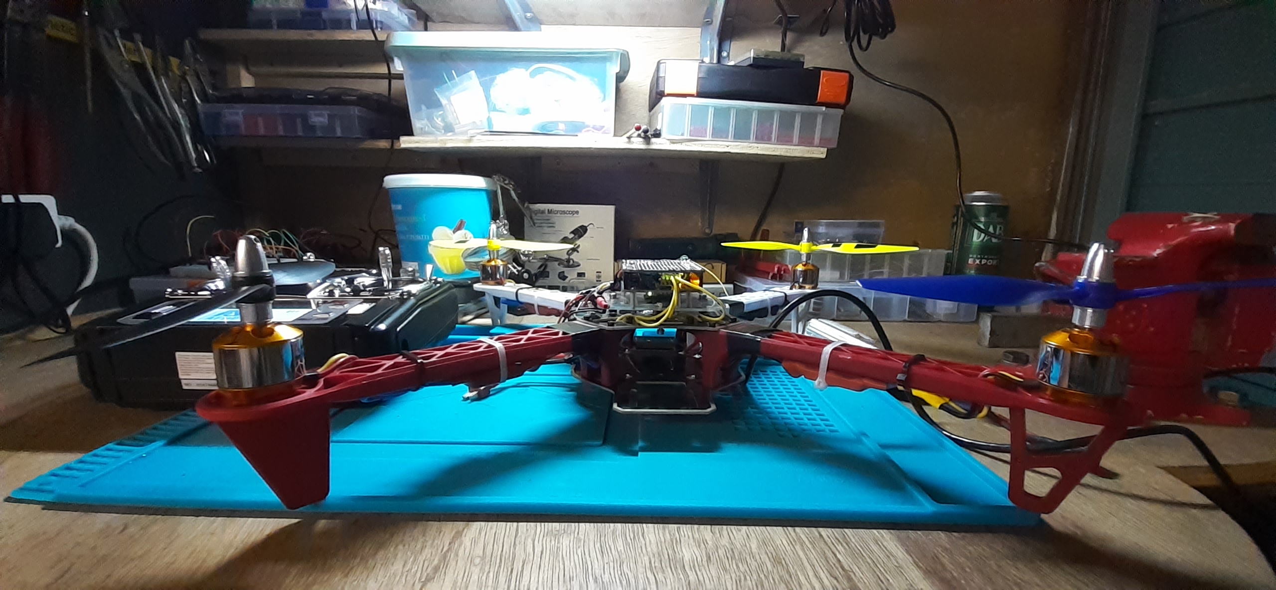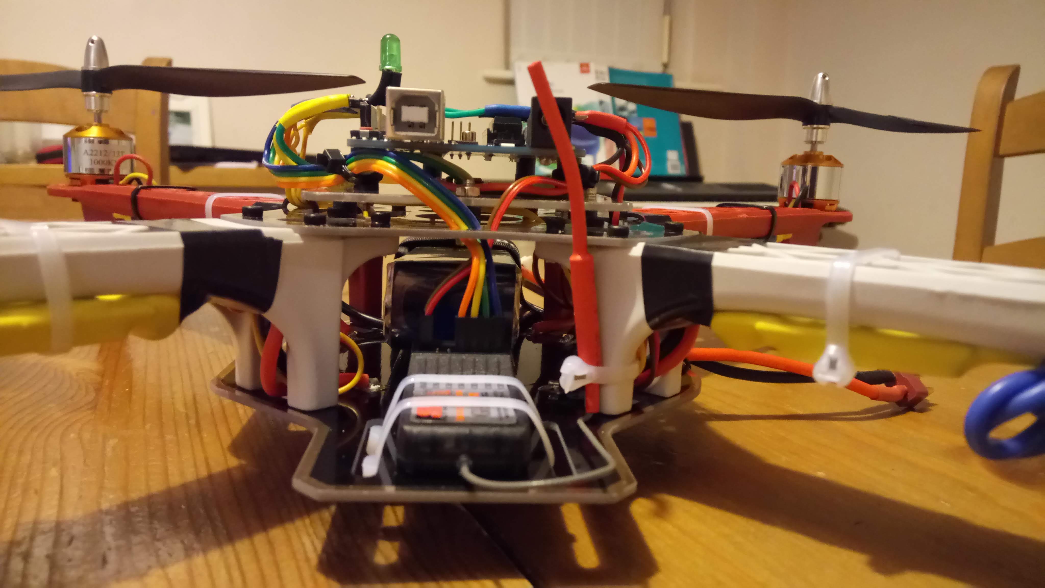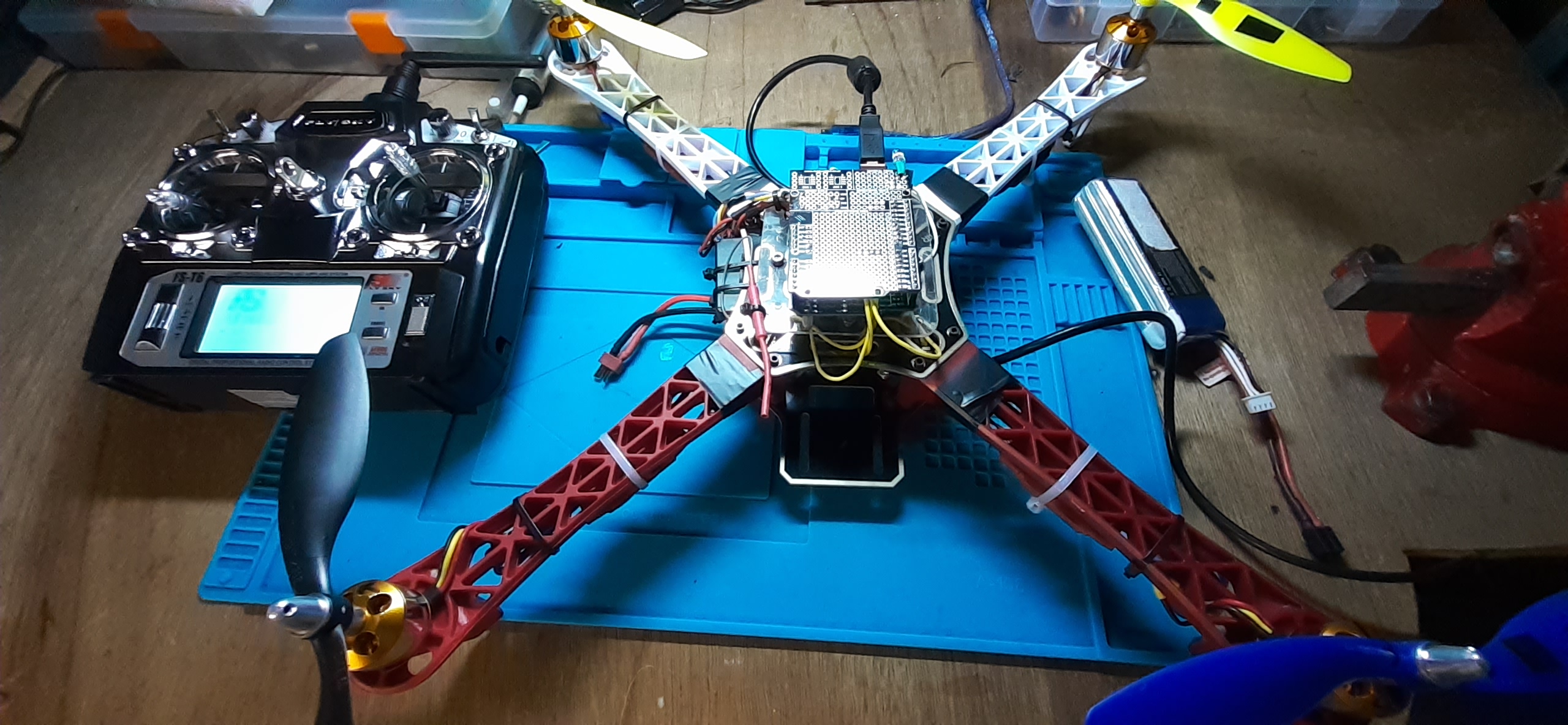 with a self-built flight controller, the first one was an Adruino Uno with a GY-521 MPU-6050 Module 3 Axis Gyroscope + Accelerometer, the second one is an STM32 Blue Pill, with GPS, Compass and an Arduino UNO telemetry system. It would fly waypoints, had altitude and GPS hold and RTH.!