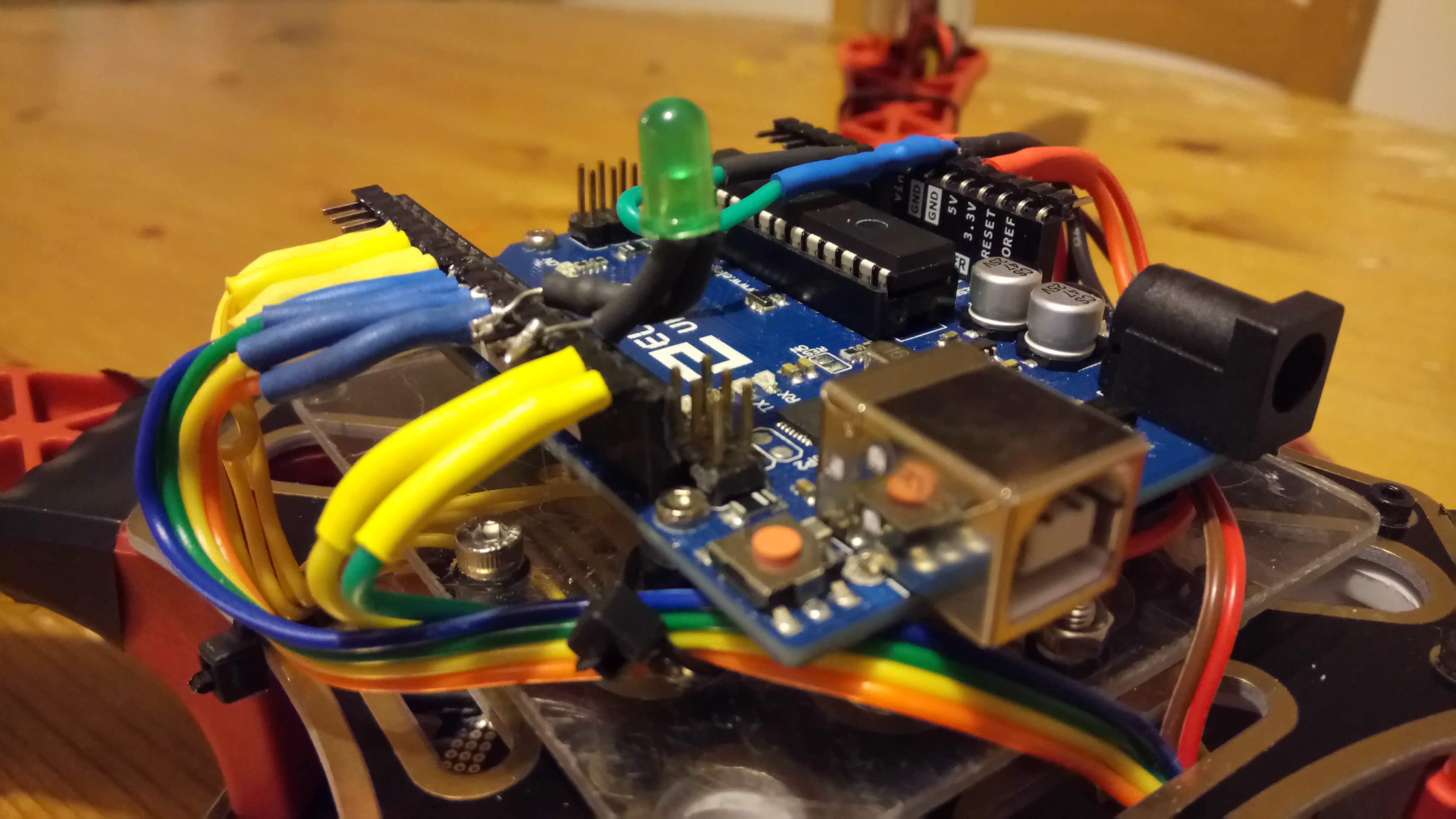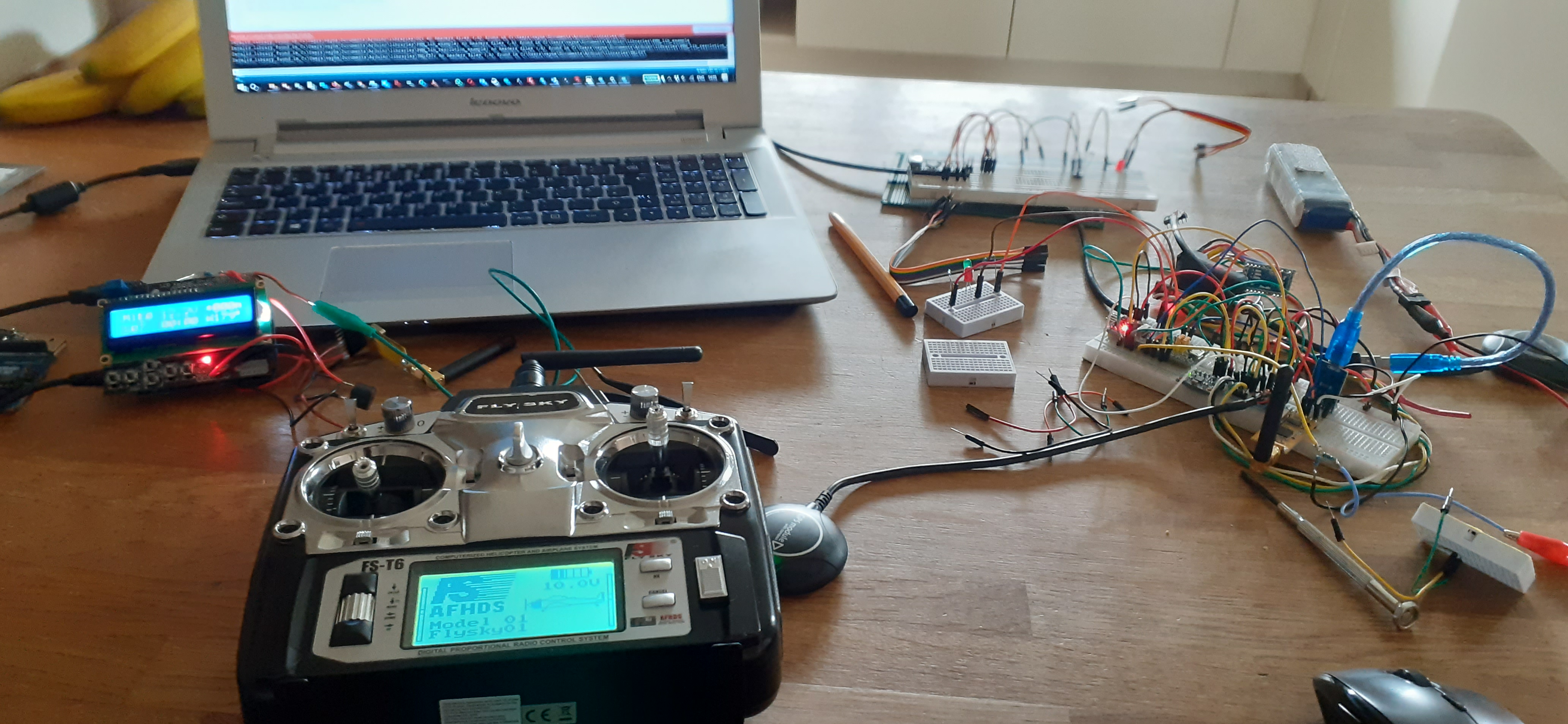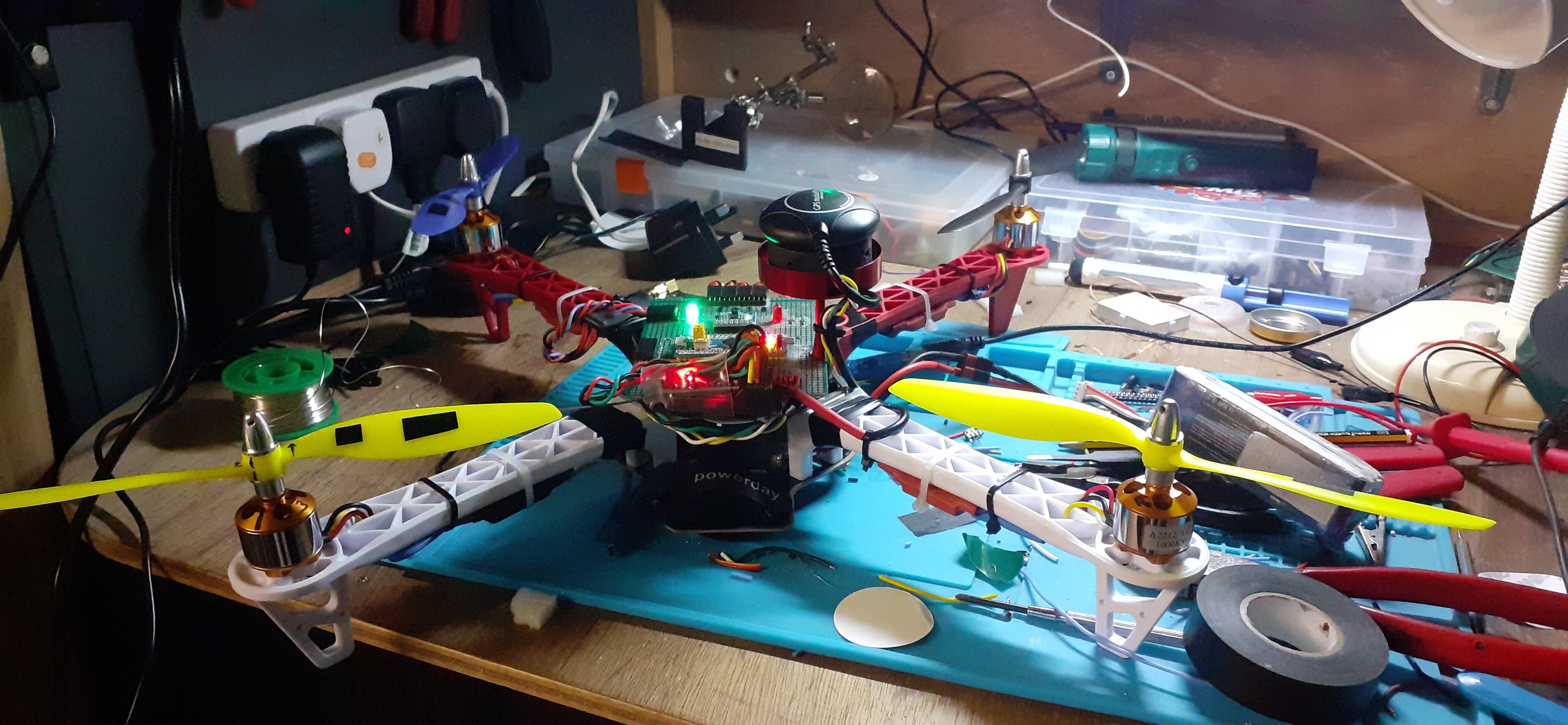 with a self-built flight controller, the first one was an Adruino Uno with a GY-521 MPU-6050 Module 3 Axis Gyroscope + Accelerometer, the second one is an STM32 Blue Pill, with GPS, Compass and an Arduino UNO telemetry system. It would fly waypoints, had altitude and GPS hold and RTH.!