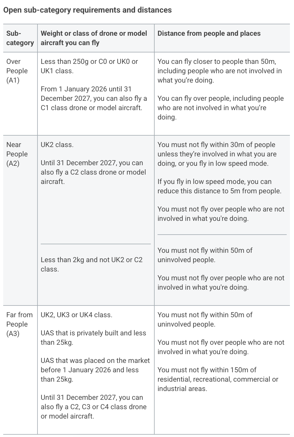 To fly in the “Near People (A2)” category you need to have either a drone with no class mark that’s under 2kg and an A2 CofC or a drone with a UK2 or C2 class mark and an A2 CofC.